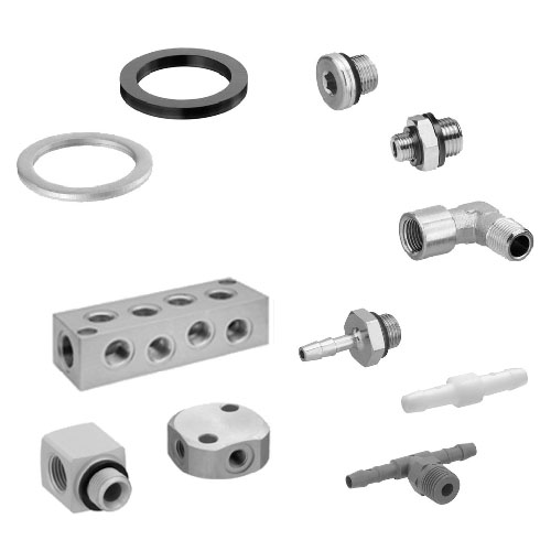 Conexões roscadas, distribuidores e réguas de distribuição, vedações e conexões de mangueira